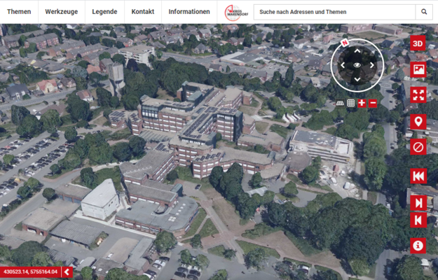 Die Anwendung wurde nun komplett überarbeitet. Sie hat eine modernere Oberfläche erhalten, die auch mobile Geräte unterstützt, und bietet neue Funktionen und Inhalte wie beispielsweise Flurstückssuche, Schrägluftbilder, 3D-Modell und, aus aktuellem Anlass, Corona Fallzahlen.