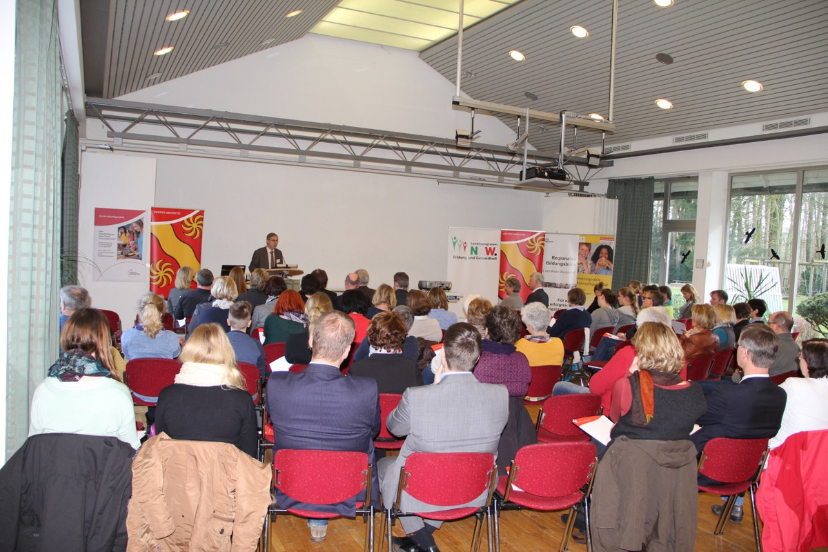 Walter Schmalenstroer, Regionalkoordinator des Landesprogramms Bildung und Gesundheit (BuG-NRW) bei der Bezirksregierung Münster, führte als Moderator durch das Programm. Dr. Thomas Ellrott, Mediziner und Ernährungspsychologe an der Universität Göttingen, berichtete sehr anschaulich, wie Kinder essen lernen und welche Einflussfaktoren dabei auf sie einwirken. Der Referent machte deutlich, wie das Essverhalten bei Kindern und Jugendlichen verändert werden kann. „Ein gutes Speisenangebot, gute Rahmenbedingungen in der Schule sowie Lehrerinnen und Lehrer, die zusammen mit den Kindern essen, haben einen günstigen Einfluss auf das Essverhalten“, so Dr. Ellrott. Deshalb sei es notwendig, die Schülerinnen und Schüler an der Planung der Schulverpflegung zu beteiligen.
