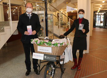 „Gerade in diesen herausfordernden Zeiten ist es wichtig, dass die Selbsthilfe sichtbar ist. Von daher freuen wir uns sehr, dass unser Fahrrad nun zum zweiten Mal im Kreishaus steht und auf die Selbsthilfe aufmerksam macht", erklärt die Mitarbeiterin der Selbsthilfe-Kontaktstelle Christiane Vollmer.