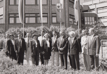 Das Bild vor dem Beckumer Ständehaus zeigt u.a: Landrat Dr. Olaf Gericke (vorne 3.v.l.), Kreis Warendorf; Landrätin Bettina Paetsch (vorne 4.v.l.), Landkreis Müritz; Dr. Wolfgang Kirsch (5.v.l.), 1990 Oberkreisdirektor des Kreises Warendorf; Gert Schultz (6.v.l), 1990 Landrat des Kreises Waren, sowie Beckums Bürgermeister Dr. Karl-Uwe Strothmann (1.v.l.).