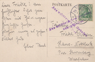 Im April 1915 schreibt Paul Friedrich an seine zwei Jahre ältere Schwester Frieda Auguste Henriette, auch Friedel genannt. Die Karte wurde „aus militärischen Gründen zurückgehalten“ und erst nach dem Tod Pauls zugestellt.