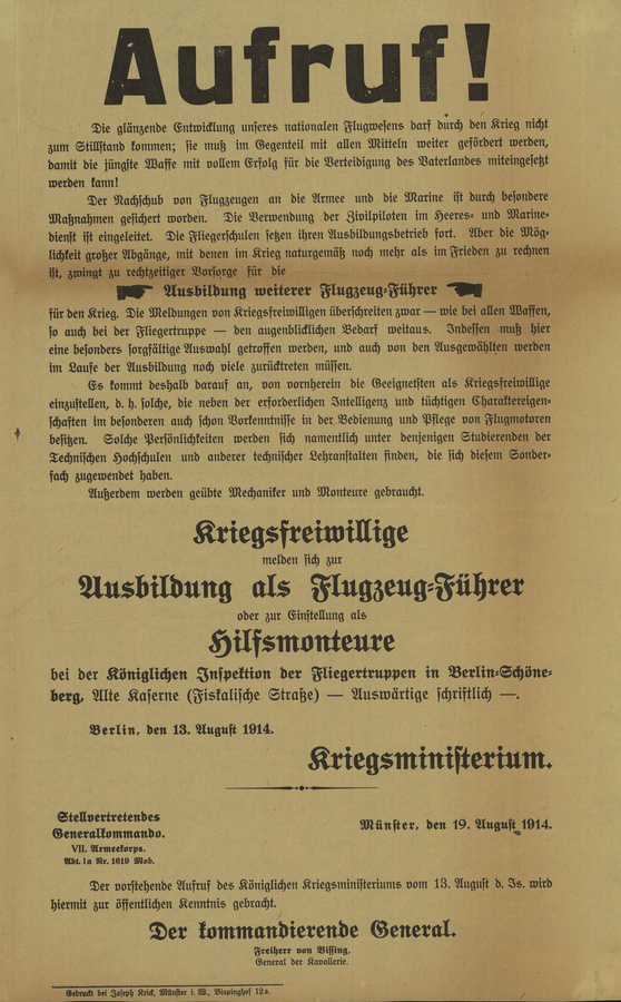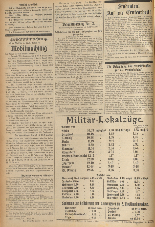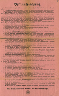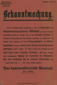 Am Abend des 1. August 1914 informiert eine Bekanntmachung des Kommandierenden Generals des VII. Armeekorps die Bevölkerung über die Erklärung des Kriegszustandes. Der kommandierende General wird damit zum eigentlichen Träger der staatlichen Macht in seinem Korpsbezirk und übernimmt die vollziehende Gewalt. Zivilverwaltungen haben den Weisungen des Generalkommandos Folge zu leisten. Zahlreiche Anordnungen greifen in das allgemeine öffentliche Leben ein: Vorverlegung der Polizeistunde, Einschränkung des Alkoholausschanks, die vorübergehende Sperrung des Fernsprechverkehrs. Unpatriotisches Verhalten prangern die Militärbehörden an.