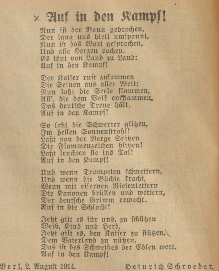 Anders sieht es da mit den Ausgaben des „Neuen Emsboten“ oder der „Glocke“ aus. Letztere veröffentlichte am 4. August ein pathetisches Gedicht mit dem Titel „Auf in den Kampf“.