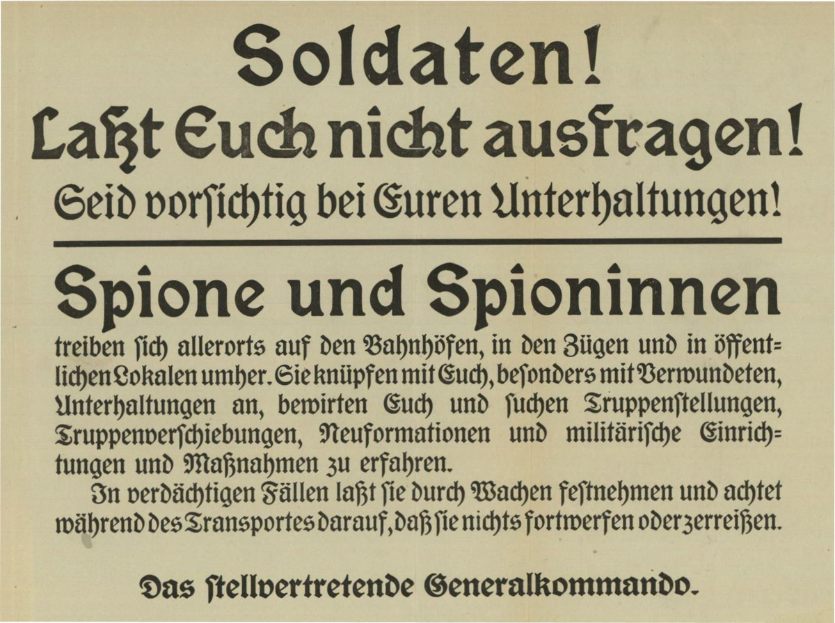 Eine Begleiterscheinung des Krieges war die zunehmende Angst vor feindlichen Spionen. Je länger der Krieg dauerte, desto häufiger wurde von Seiten des Militärs und der Behörden vor feindlicher Spionage gewarnt.