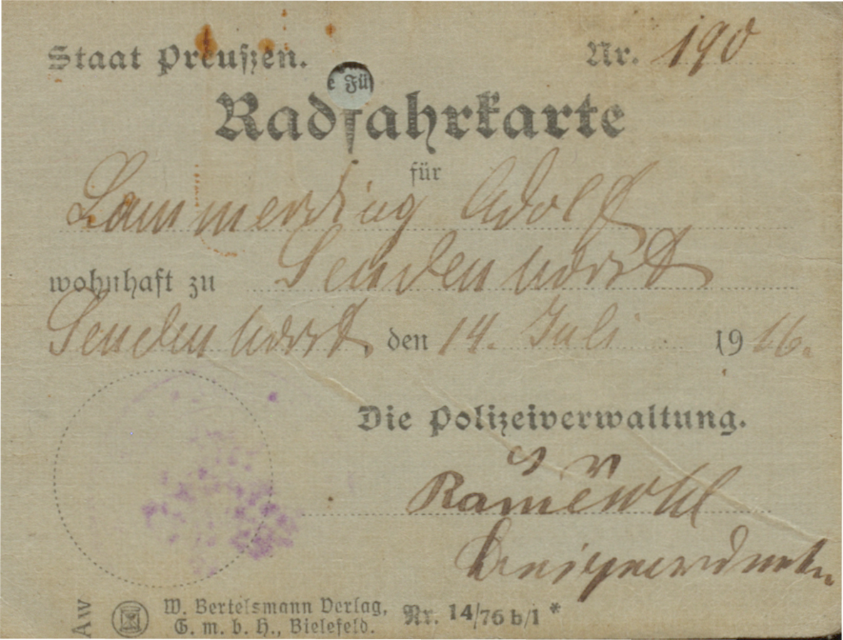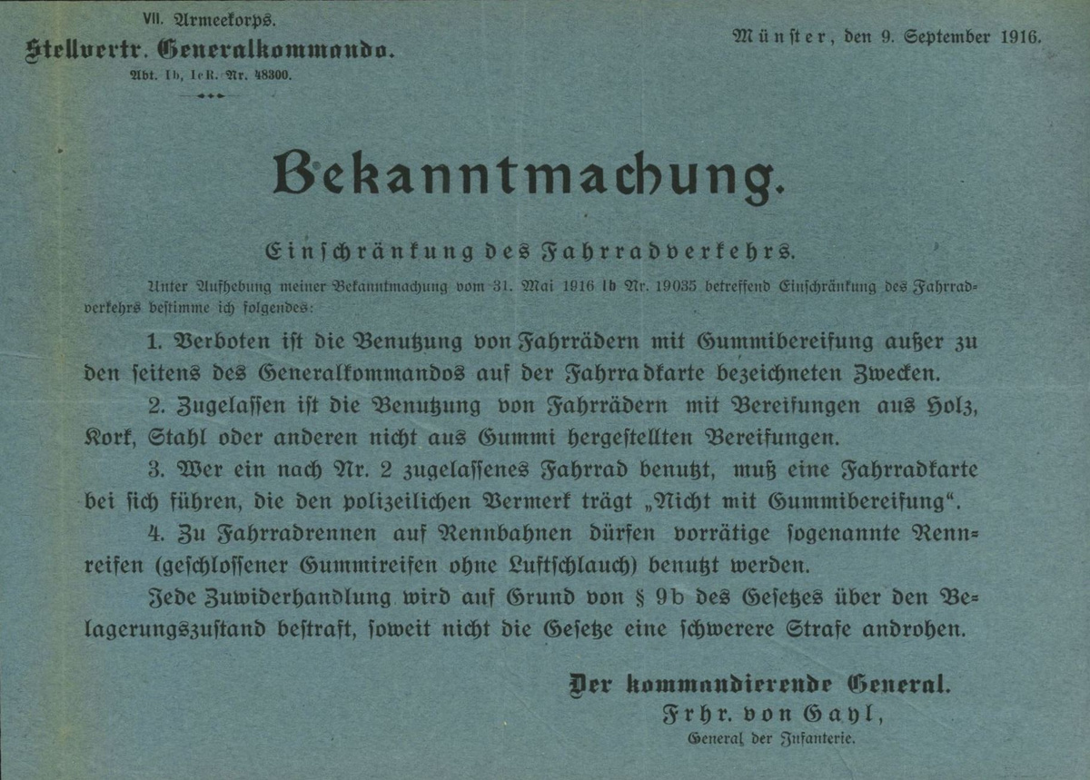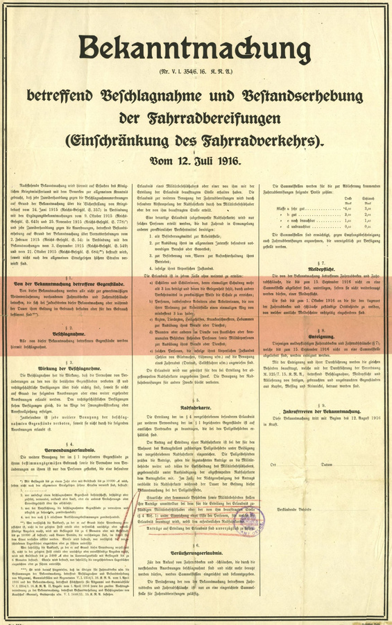Kautschuk war für verschiedene Rüstungsgüter kriegswichtig. Da das Deutsche Reich nach dem Kriegseintritt von wichtigen Rohstoff-Lieferungen abgeschnitten war, wurde der Fahrradverkehr eingeschränkt. Die Bevölkerung musste sämtliche Fahrradreifen abgeben.