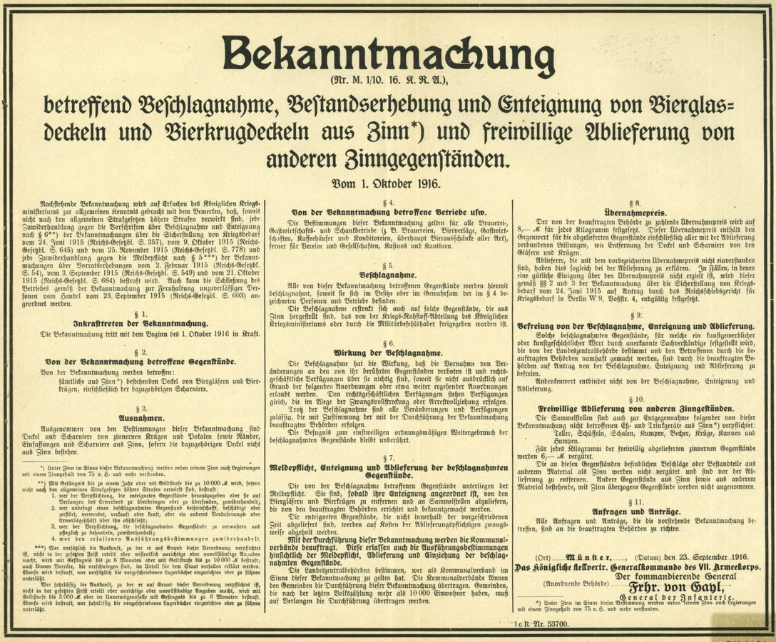 So führte der Rohstoffmangel zu Aufrufen, wertvolle und kriegswichtige Materialien wie Edelmetalle oder auch Gummi abzuliefern oder gegen andere, in größerem Umfang verfügbare Stoffe einzutauschen.