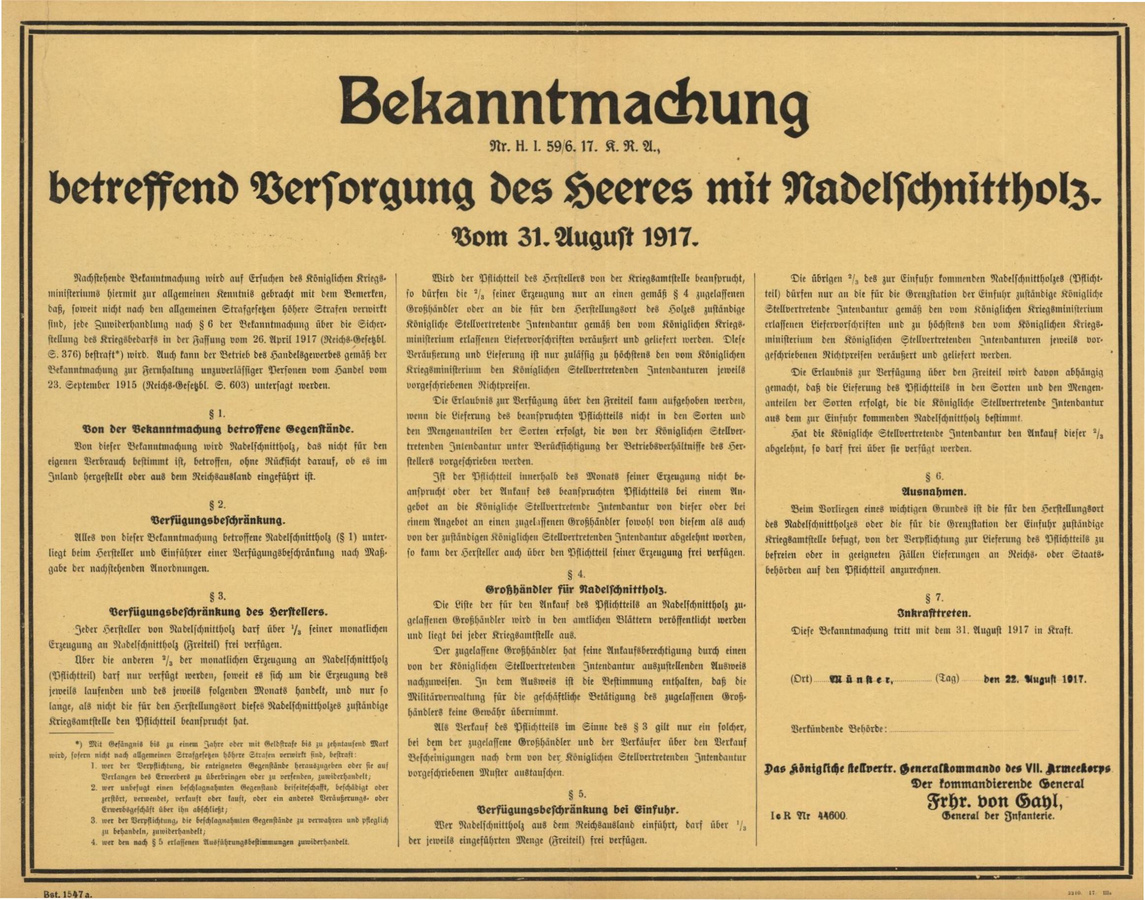 Die Nachfrage nach „kriegswichtigen“ Hölzern beispielsweise für den Bau der Schützengräben an der Westfront oder für die Industrie stieg mit der Mobilmachung stark an. Zahlreiche Verordnungen und Bekanntmachungen der Kriegszeit reglementieren die Nutzung von Holz für private Zwecke.