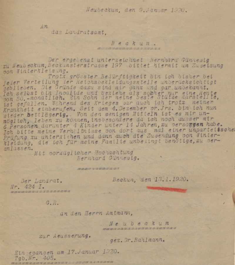 „Trotz größter Bedürftigkeit bin ich bisher bei der Verteilung der Reichsbekleidungsstelle unberücksichtigt geblieben.