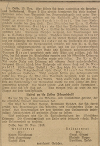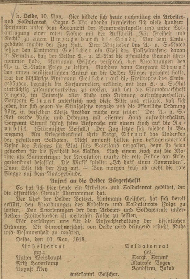 Ein interessantes Bild zeigt sich im heutigen Ostkreis. In Oelde übernimmt schon am 10. November ein aus drei Arbeitern und drei Soldaten gebildeter und von einer großen Menge unterstützter Rat die Gewalt.