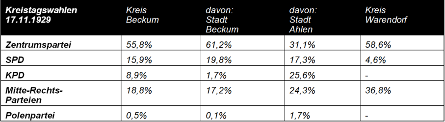 Aufgrund seiner Verwurzelung in der katholischen Region (1925: Kreis Warendorf 97% Katholikenanteil, Kreis Beckum: 84%) konnte das Zentrum bis 1933 den Großteil seiner Wähler an sich binden.