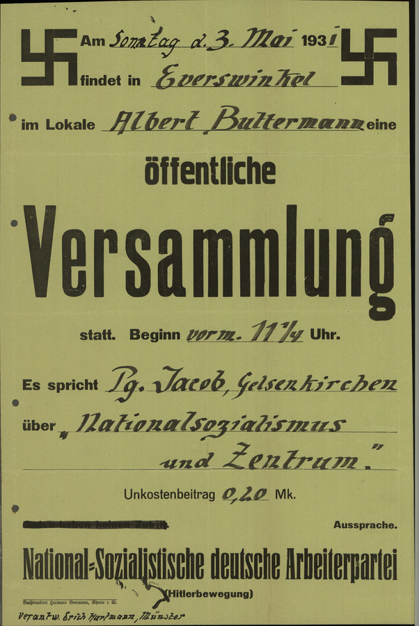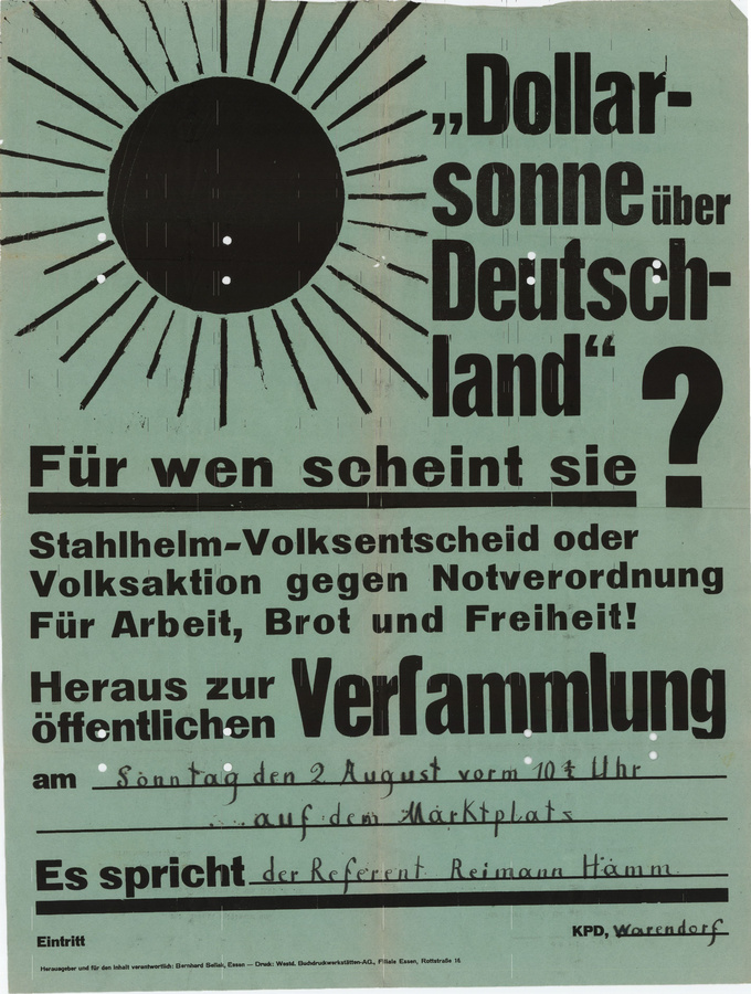 Rechts sieht man den Aufruf der KPD Warendorf für eine Versammlung im August 1931. Als Redner angekündigt ist Max Reimann, 1920 Ahlener KPD-Chef und nach 1949 kommunistischer Bundestagsabgeordneter.