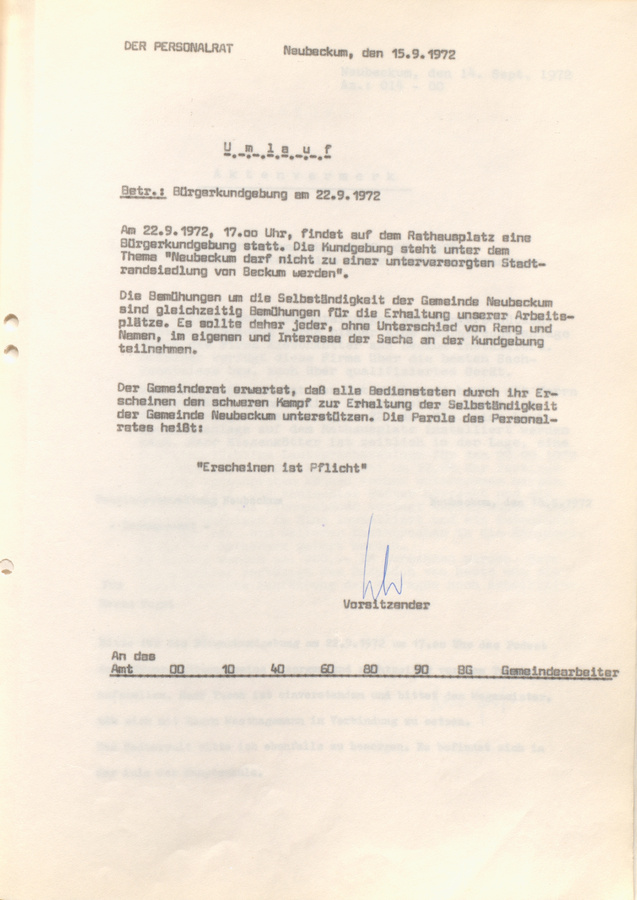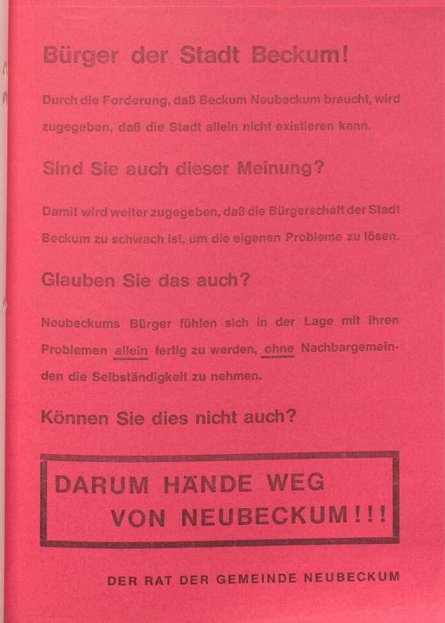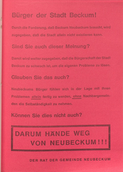 Am 1. Januar 1975 verliert Neubeckum seine Selbständigkeit und wird in die Stadt Beckum eingegliedert