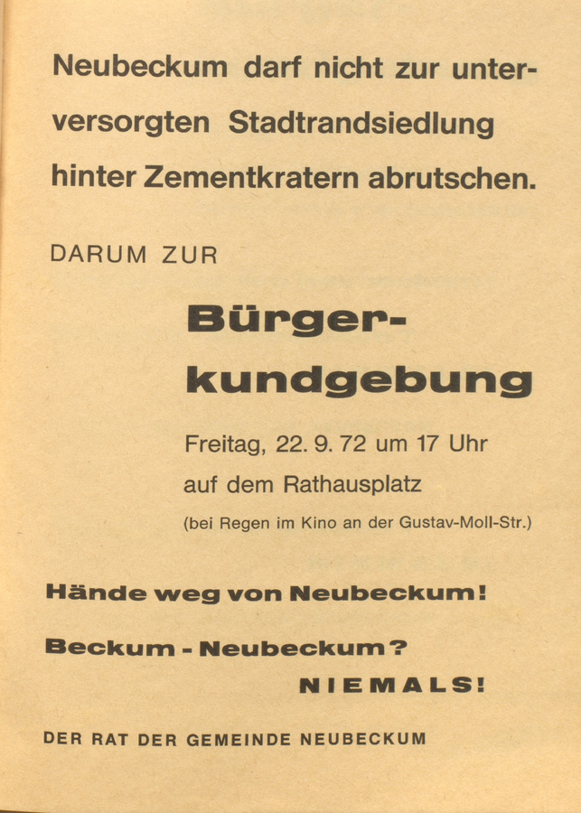 Durch Demonstrationen wie in Lippborg oder Neubeckum, Volksabstimmungen in Freckenhorst und Stromberg, sowie durch zahlreiche Eingaben an die Verwaltung und eine Fülle an Leserbriefen wird versucht, Einfluss auf die Neuordnung der betroffenen Kommunen zu nehmen. Dabei beschränkt sich der Protest auf das unmittelbare lokale Umfeld. Die Ziele und der Zweck der Gemeindeneugliederung an sich werden nicht in Frage gestellt.