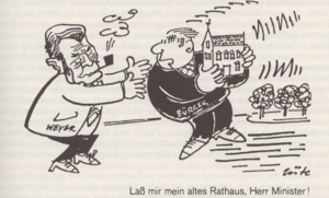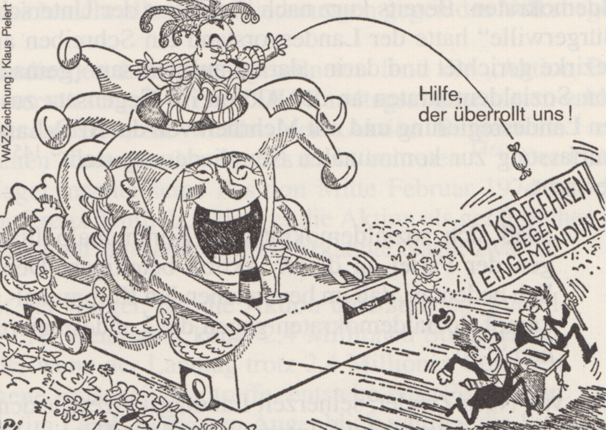 Die zeitgenössische Karikatur (unten) zur kommunalen Neuordnung in Nordrhein-Westfalen von Günther „Tüte“ Hagedorn verdeutlicht das Gefühl, mit dem sich viele Bürger konfrontiert sehen.