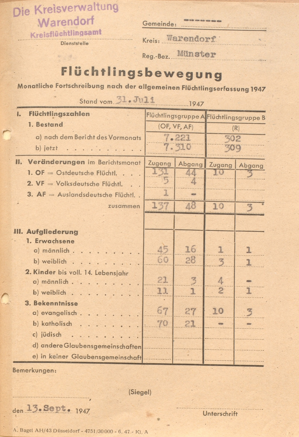 Besonders im Münsterland ist man mit einer großen Zahl von Flüchtlingen konfrontiert. Durch eine Anweisung der britischen Militärbehörde vom 21. November 1945 sollen auf Provinzial-, Regierungsbezirks- und Kreisebene Flüchtlingsausschüsse gebildet werden, deren Aufgabe darin besteht die Behörden in Fragen der Flüchtlingsproblematik zu beraten.