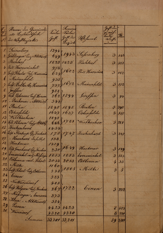 1,5% der Wahlberechtigten der ersten Klasse haben also dasselbe Stimmengewicht wie 89% aus der dritten. Die 228 Taler Abgaben des Grafen Merveldt machen im Übrigen 39% des gesamten Grundsteueraufkommen Freckenhorsts aus.
