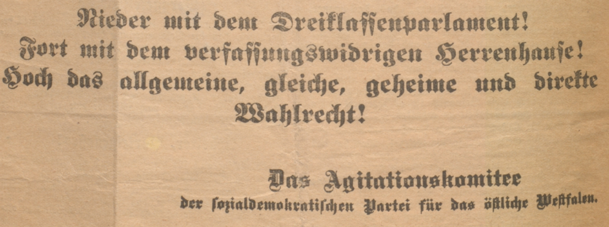 Die preußische Obrigkeit – ohnehin von einer geradezu paranoiden Furcht vor einem sozialistischen Umsturz getrieben – warnt, im hiesigen Falle in Person des Münsteraner Regierungspräsidenten, vor Kundgebungen gegen das Dreiklassenwahlrecht (s. unten).