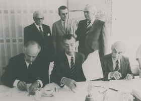 Das Bild zeigt die Unterzeichnung des Gebietsveränderungsvertrages zwischen den Kreisen Beckum und Warendorf am Mittwoch, 13. Juni 1973 in Warendorf. Sitzend (von links) OKD Schulte, Kreisdirektor Dr. Thöne, OKD Dr. Schnettler; stehend (von links) Landrat Dr. Höchst, Kreisdirektor Herold, Landrat Frisch.