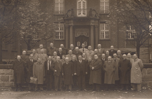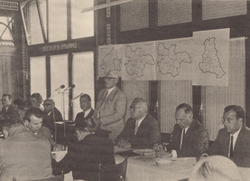 In der Mitte stehend der Warendorfer Landrat Dr. Höchst, links daneben der Bürgermeister Dr. Strake aus Harsewinkel, links davon OKD Dr. Schnettler. Rechts vom Redner der Warendorfer Landrat Frisch, rechts davon OKD Schulte.