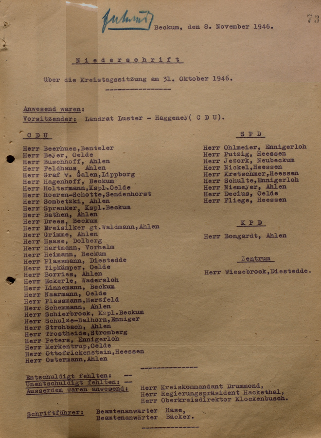 Rechts die erste Seite des Protokolls der konstituierenden Kreistagssitzung des Beckumer Kreistages nach der Kreistagswahl vom 13. Oktober 1946.