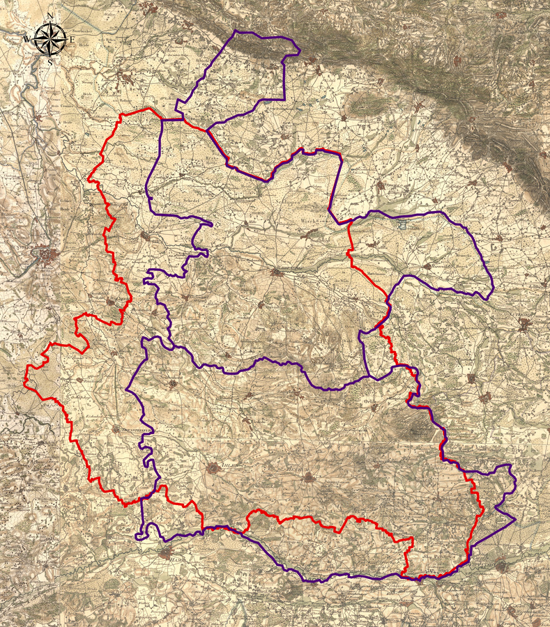 Die zugrunde liegende Karte (rechts) entstand in den Jahren 1795 bis 1813 unter Leitung des preußischen Generalmajors Le Coq. Sie stellt die erste systematische Landesvermessung in NRW dar. Dargestellt sind die aktuellen Grenzen des Kreises Warendorf (rot) sowie Grenzen der Altkreise Warendorf und Beckum (violett).