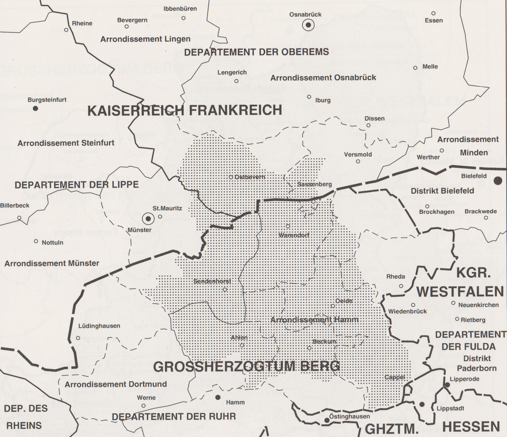 Ein Großteil des heutigen Kreises Warendorf lag ab 1810 im Großherzogtum Berg, ein Satellitenstaat Frankreichs.
