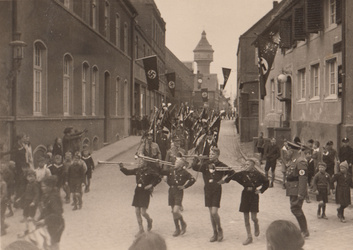 Die NS-Organisationen überzogen die Kreise mit ihrem Netz und mobilisierten die Bevölkerung zu zahlreichen öffentlichen Loyalitätsbekundungen gegenüber dem Regime. Der 1. Mai 1938 wurde in Ennigerloh mit einem Festumzug gefeiert (links).