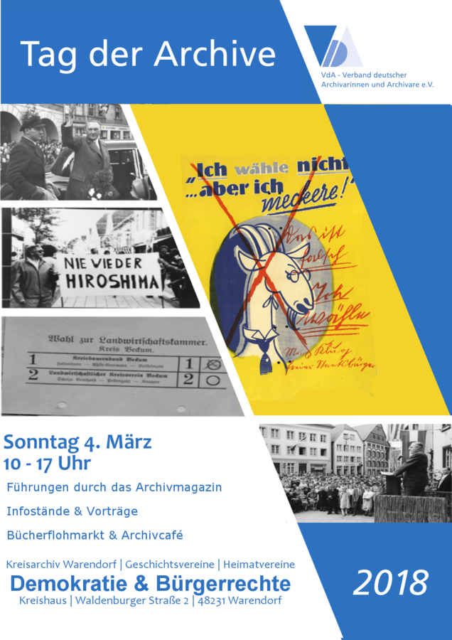 Am diesjährigen Tag der Archive am Sonntag, 4. März 2018, bietet das Kreisarchiv unter dem bundesweiten Motto "Demokratie und Bürgerrechte" zwischen 10-17 Uhr Einblicke hinter seine Kulissen.
