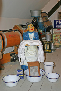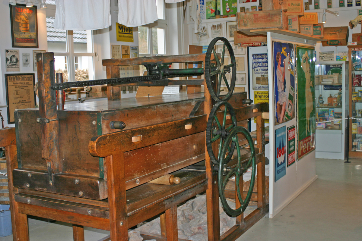 In der Ausstellung sind auch viele verschiedene Ausführungen des Waschbretts, hergestellt aus Holz, geriffeltem Glas oder gewelltem Zinkblech, zu sehen und es lässt sich schnell erahnen, dass Waschen anno dazumal mit viel Mühe verbunden war. Wunde Hände und ein schmerzender Rücken gehörten zum Waschtag dazu. Heute jedoch kommt das historische Waschgerät allenfalls noch im „Skiffle-Rock“ zum Einsatz. Aber auch kuriose Geräte, wie z.B. die Dampfwaschmaschine „Schneewittchen“ oder das „Wäschewunder“ gibt es zu bestaunen.