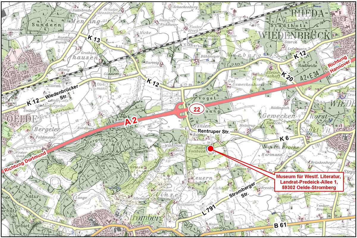 Anschrift/Anfahrt: Landrat-Predeick-Allee 1, 59302 Oelde-Stromberg. Es stehen ausreichend Parkplätze zur Verfügung. Anreise ist mit dem Rad zum Beispiel über den Werseradweg möglich, www.werseradweg.de