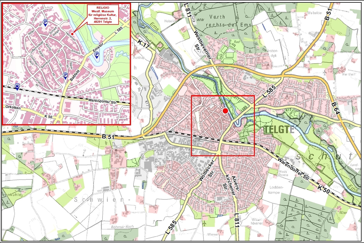 Anschrift/Anfahrt: Herrenstr. 1-2, 48291 Telgte. - Das Museum liegt im Stadtzentrum nahe der Wallfahrtskapelle (s. Skizze). Parkplätze sind ausgeschildert. Mit der Bahn (Warendorf/Bielefeld – Münster) gut erreichbar. Das Museum ist barrierefrei. Gutes Gastronomie-Angebot in der Innenstadt.