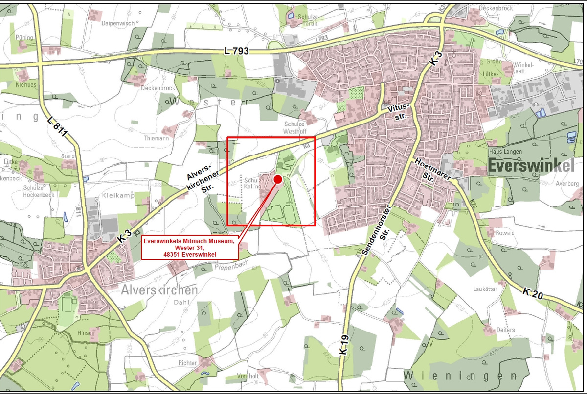 Anschrift/Anfahrt: Wester 31, 48351 Everswinkel, von der Alverskirchener Straße (K3) zwischen Alverskirchen und Everswinkel aus in Höhe Waldorfschule / Sportpark Wester / Mitmach Museum abbiegen und links halten (s. Skizze). Parkplätze gibt es an der Waldorfschule oder am Sportpark Wester. Mit dem Bus (R 22/23 Münster – Warendorf) bis zur Haltestelle Sportpark Wester. Das Radwegenetz Münsterland (Rundrouten 101 und 109) führt direkt am Museum vorbei.