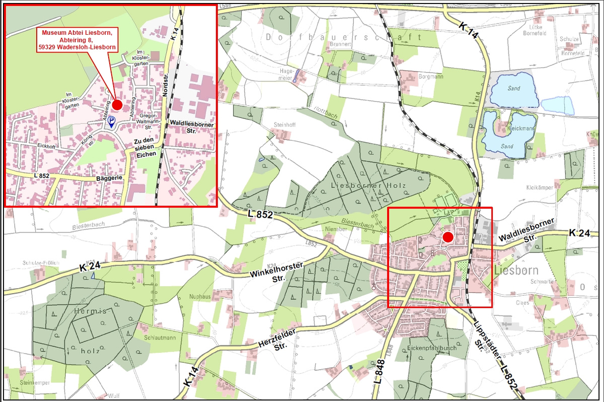 Anschrift/Anfahrt: Abteiring 8, 59329 Wadersloh-Liesborn (s. Plan als PDF unten). Das Museum befindet sich im Ortskern von Liesborn direkt an der Kirche in einem ehemaligen Benediktinerkloster. Es ist für Menschen mit Gehbehinderung zugänglich. Parkplätze sind am Museum vorhanden. Mit der Bahn erreicht man Liesborn über Lippstadt und Oelde und von dort per Bus. Mit dem Rad ist das Museum z.B. über den Ostkurs der 100 Schlösser-Route erreichbar.