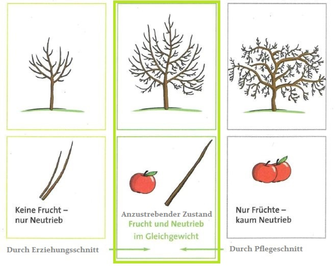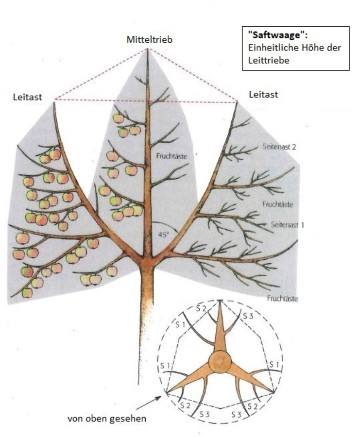 Bei der Pflanzung des Baumes wird die künftige Pyramidenkrone mit 3-4 Leitästen und einem Mitteltrieb festgelegt. Diese sind als Traggerüst eine gute Grundlage für eine stabile Krone und ein langes Baumleben (s. Abbildungen). Das Obst wird später an den Seiten- und Fruchtästen wachsen.