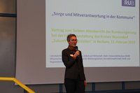 Prof. Dr. Rolf G. Heinze, Mitglied der Siebten Altenberichtskommission; Lehrstuhlinhaber für allgemeine Soziologie, Arbeit und Wirtschaft und wissenschaftlicher Direktor des Instituts für Wohnungswesen, Immobilienwirtschaft, Stadt- und Regionalentwicklung der Ruhr-Universität-Bochum, stellte in seinem Vortrag die zentralen Inhalte und Handlungsempfehlungen des Siebten Altenberichts „Sorge und Mitverantwortung in der Kommune – Aufbau und Sicherung zukunftsfähiger Gemeinschaften“ vor. Dabei betonte er insbesondere, dass Kommunen, Sozialorganisationen und weitere Akteure nicht nur ihre eigenen Organisationsinteressen verfolgen sollten, sondern dem sogenannten „Silodenken“ aktiv begegnen, um Doppelstrukturen zu vermeiden.