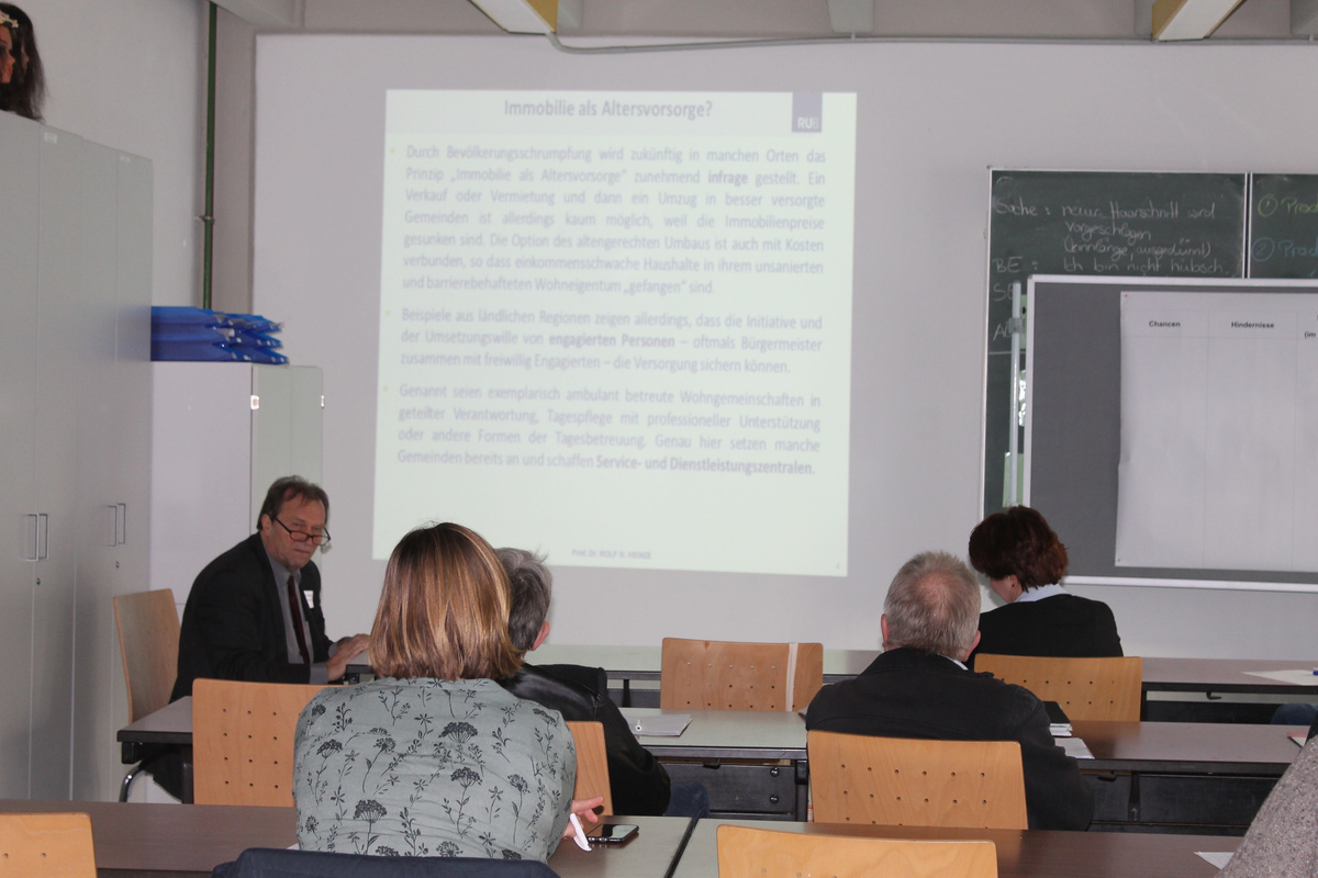 Im ersten Workshop hielt Prof. Dr. Rolf G. Heinze einen kurzen Impulsvortrag zum Thema „Von der Wohnungspolitik zu einer umfassenden Wohnpolitik“. Er betonte, dass eine verstärkte Förderung des sozialen Wohnungsneubaus sowie der genossenschaftlichen Wohnformen benötigt werde. Ebenso wurde deutlich, dass technischen Assistenzsystemen eine hohe Bedeutung für mitalternde Wohnungen zukommt und diese die Sicherheit und Unabhängigkeit im Alter verbessern können.