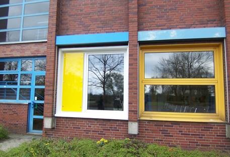 Aus Kostengründen wurde der Austausch der Aluminiumfenster gegen Kunststofffenster mit 3-fach Verglasung und klassischer Mechanik favorisiert. Dabei wurden festverglaste Fensterelemente mit Dreh-Kippflügeln kombiniert. Die Rahmenfarbe der Fenster wurde, wie bereits bei den Anbauten für das Fachseminar für Altenpflege und dem Anbau von acht Klassenräumen in weiß ausgeführt.