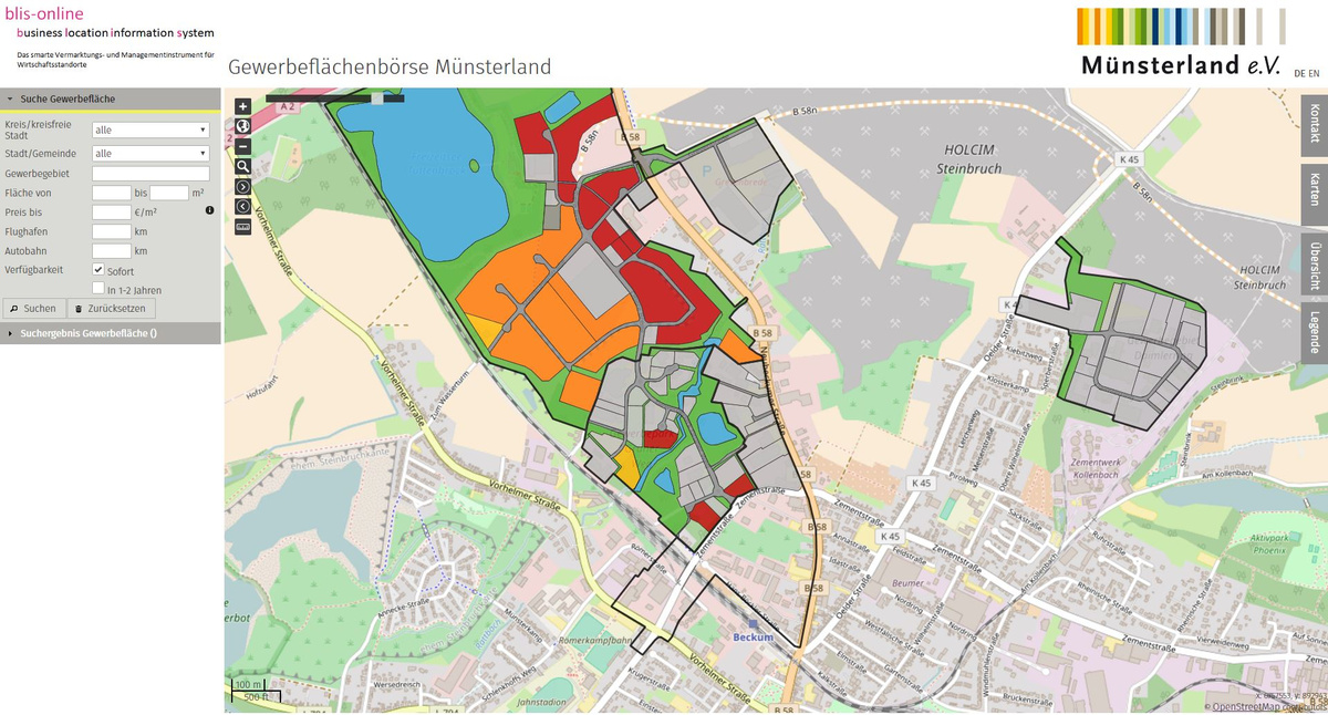 Eine Übersichtskarte zeigt dem möglichen Investor, in welchem Teil des Münsterlandes das entsprechend gewählte Gebiet zu finden ist, in der Detailansicht erfährt er dann ebenso, wie sich die unmittelbare Nachbarschaft des ausgewählten Gebietes darstellt.